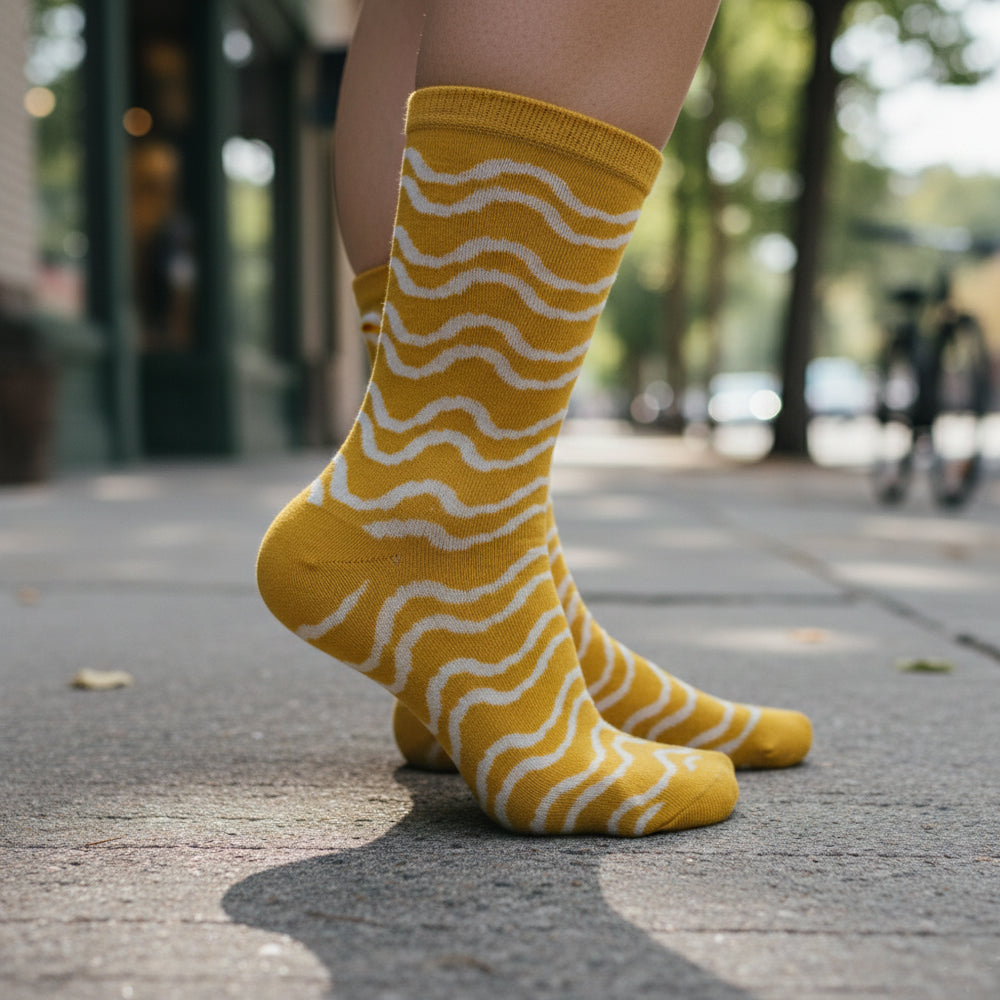 Women Yellow Wave Pattern Crew Socks